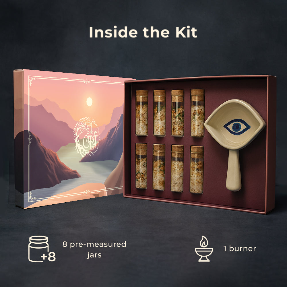 Each kit contains 8 pre-measured jars of a special cleansing blend, along with a burner for safe and easy use. Simply light the mixture and move it around your home or loved ones to gently remove negative energies and create a shield of positivity.